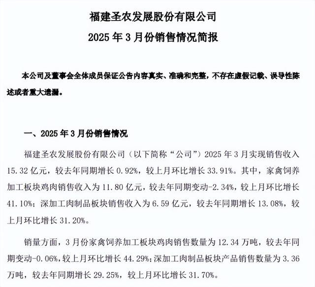 圣农发展:2025年3月及1季度鸡肉销售及业绩情况