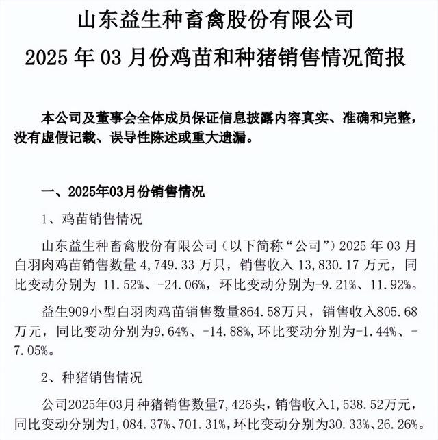 益生股份2025年3月白羽肉鸡苗销售数量4749.33万只,环比减少9.21%,但同比增长11.52%,且连续6个月同比增长;销售收入1.38亿元,环比增长11.92%,结束连续3个月的环比减少,但同比减少24.06%,连续3个月同比减少;经计算得出,2025年3月,鸡苗销售均价为2.91元/只,环比上涨23.27%,止跌上涨,结束连续3个月的环比下跌,但同比下跌31.91%,连续3个月同比下跌。