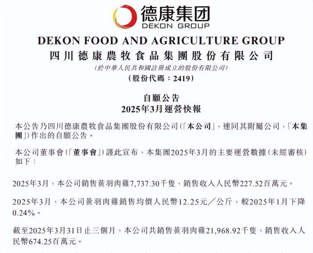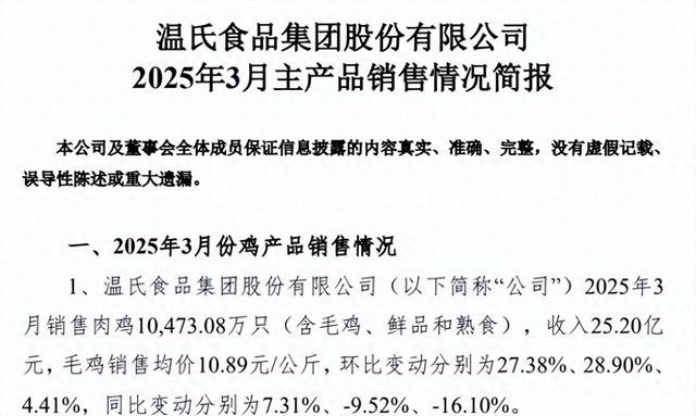 2025年1季度,公司累计销售肉鸡(含毛鸡、鲜品和熟食)数量为2.82亿只,同比增长5.39%;累计销售收入为68.44亿元,同比减少10.55%。