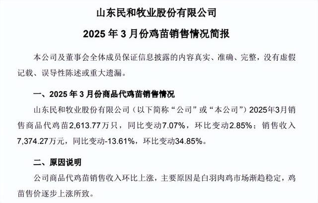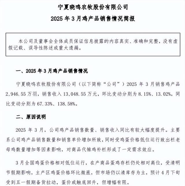 晓鸣股份表示,2025 年 3 月,公司鸡产品销售数量、销售收入同比有较大幅度提升。主要系公司鸡产品销售数量和销售单价增加所致,同时受鸡蛋价格低位运行致出栏老母鸡数量增加等因素影响,对商品代雏鸡补栏形成了一定需求效应。