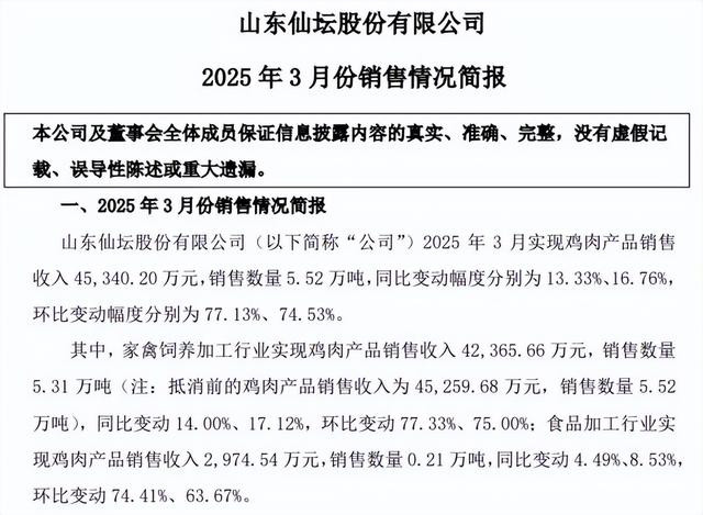 仙坛股份表示,山东仙润食品有限公司项目二期工程逐步投产,生产产能逐步释放,生产加工数量逐步增加,销售数量和销售收入也随之同比增加。叠加 2025 年 3 月生产天数较 2025 年 2 月增加,致公司鸡肉产品销售数量环比增加,销售收入也相应环比增加。